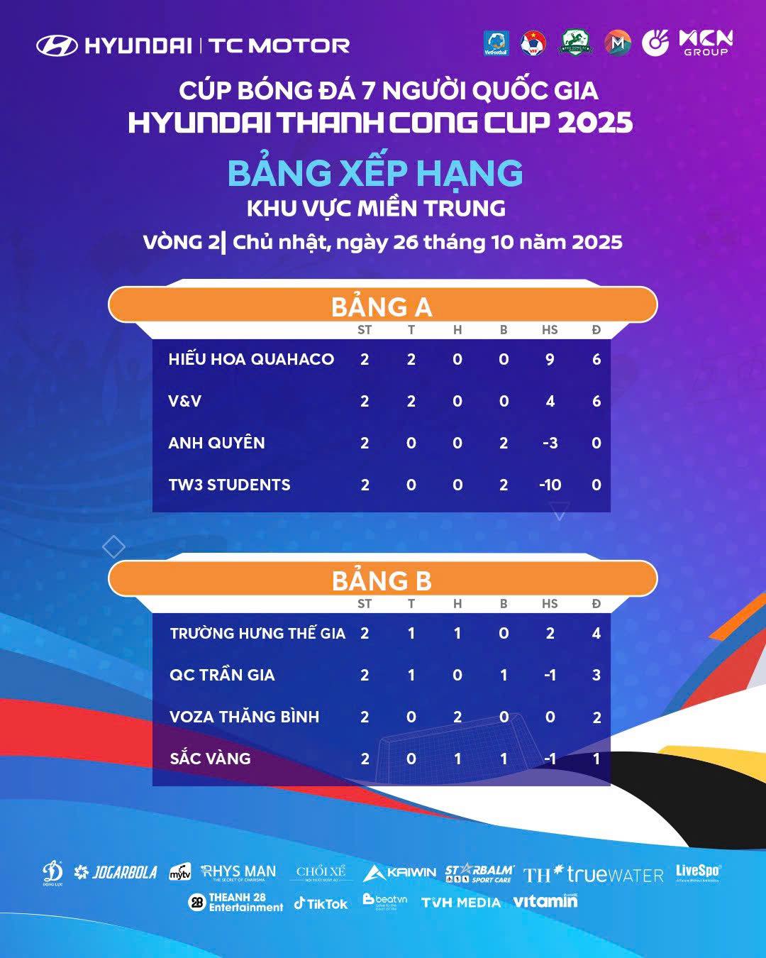 Bảng B, cục diện chưa ngã ngũ khi cơ hội vẫn còn nguyên cho Trường Hưng Thế Gia, Quảng cáo Trần Gia, VoZa Thăng Bình và Sắc Vàng. Hai tấm vé đi tiếp sẽ được định đoạt qua vòng đấu thứ 3 Cúp bóng đá 7 người Quốc gia Hyundai Thành Công Cup 2025 – Khu vực miền Trung.